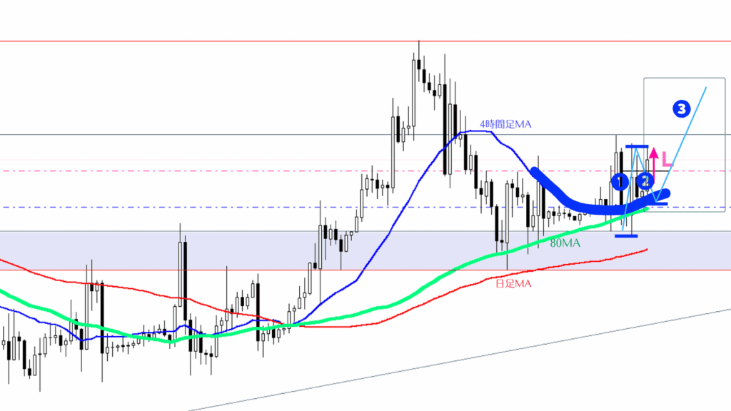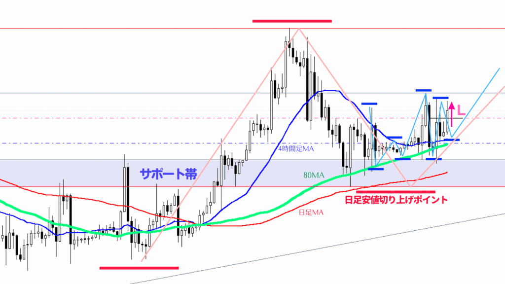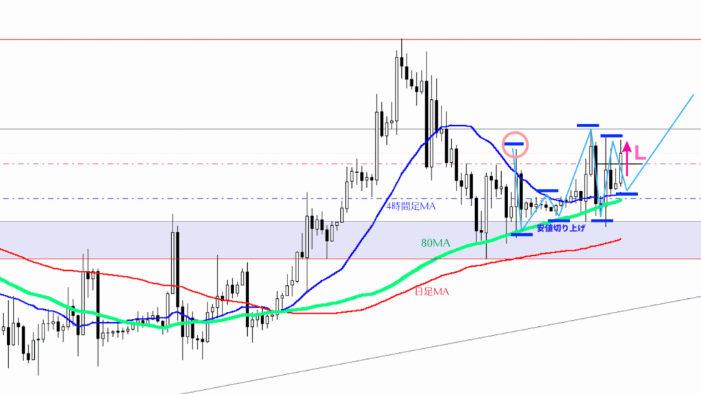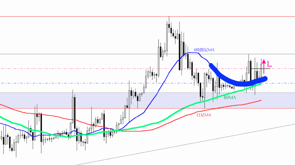 ▼下降していた4時間足MAが水平から上向きになりつつあり上昇優位性が出てきている