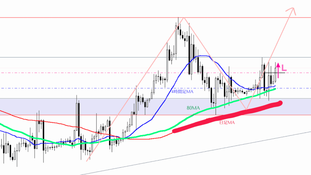 ▼4時間足80MAもガンガンに上向きであり下からレートを支えている