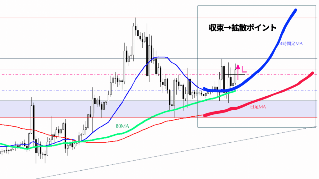 ▼日足MAに対して4時間足MAが収束→拡散していくポイントである
