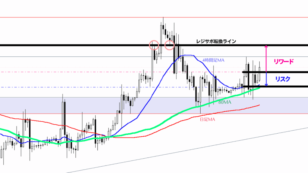 なお、想定リワードは4時間足レベルのレジサポ転換ラインまでですのでリスクリワードは1:1.8程度となります。