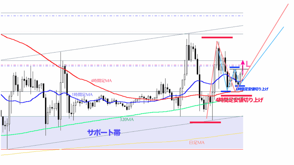 そのような上位足相場環境の中で、4時間足レベルの安値切り上げポイント(赤線)の中で1時間足レベルの安値切り上げポイント(青線)を形成してきました。