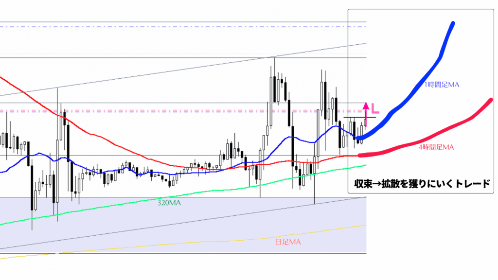 • 4時間足MAに対して1時間足MAが収束→拡散するポイント
