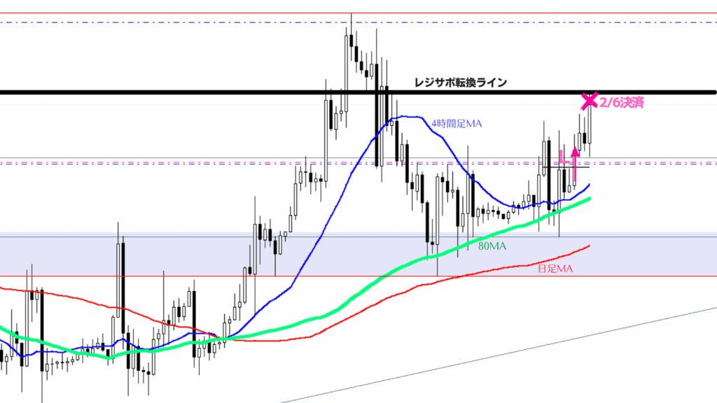 想定通り、4時間足レベルのレジサポ転換ラインにレートが到達しましたのでここで2/6のポジションを決済しました。