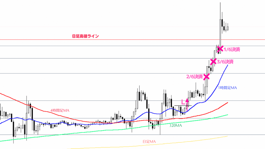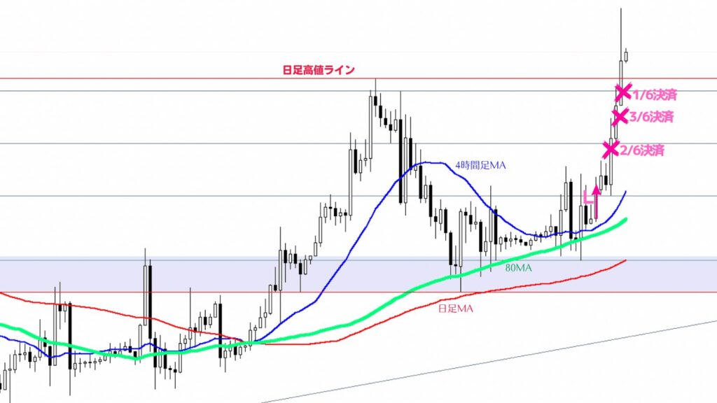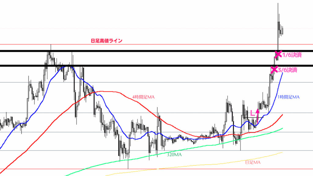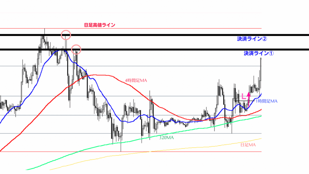 日足高値ライン直下に決済ラインを置かなかった理由は、いつもそういった高値にギリギリ届かずに反転してきて大幅に利益を吐き出すということが多いので、今回はそれを防ぐために切り下げた高値ライン直下に決済ラインをおきました。