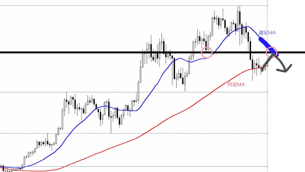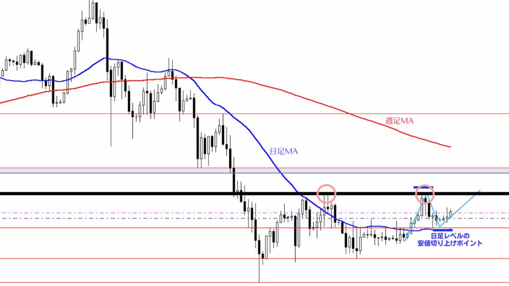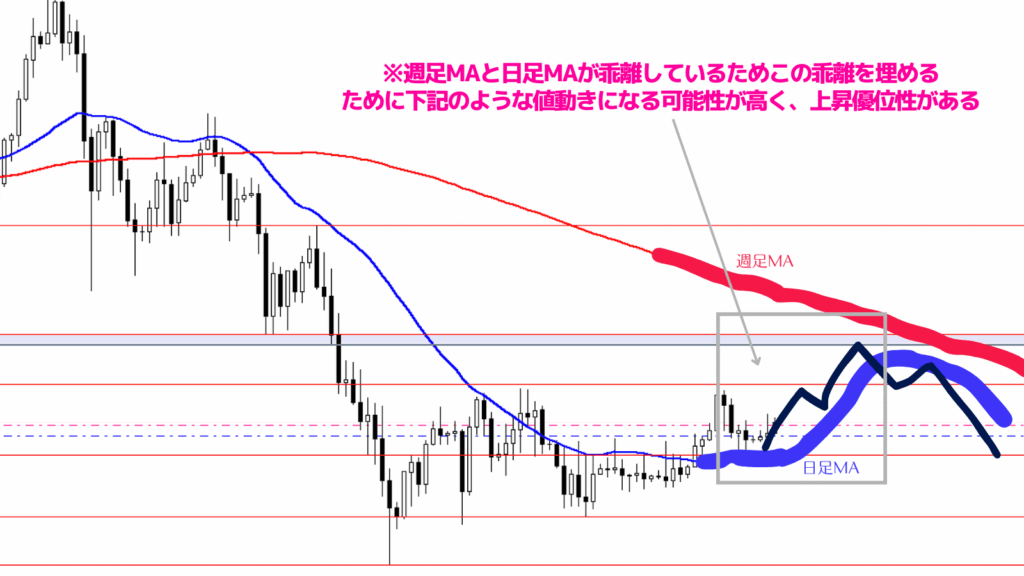 週足チャートを見ると、週足は下降トレンド中ですが週足レベルの戻り売りが入ってくるのは週足レベルの安値ラインと週足MAが重なる所あたり(=下記チャートのピンク丸印)ですので、そこまでは上昇余地があると判断できます。