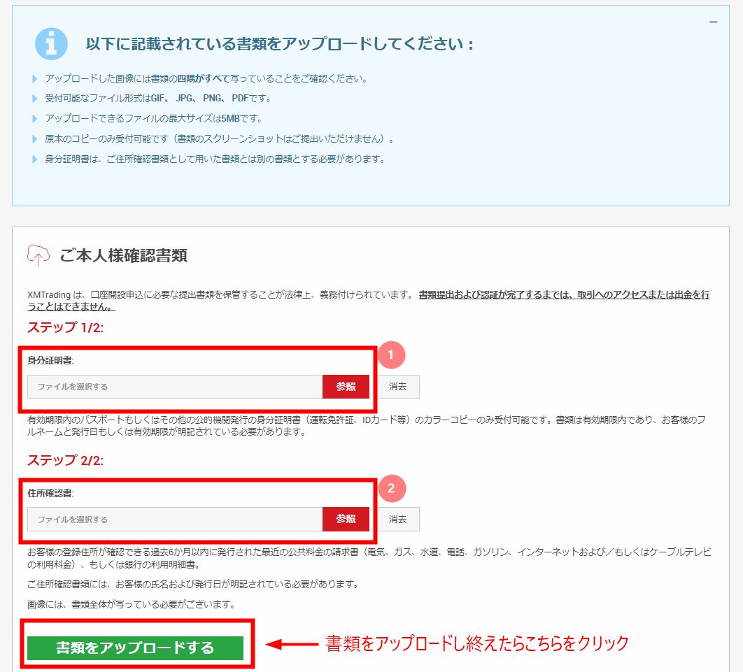 必要書類のアップロード画面に進んだら、身分証明書と現住所確認書類のアップロードを行い、それが終われば