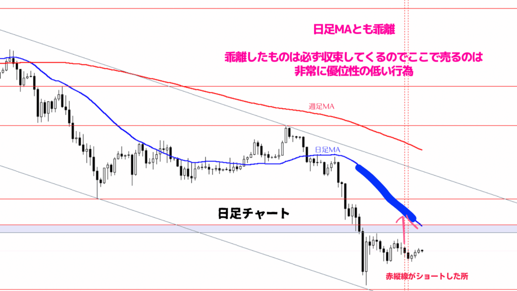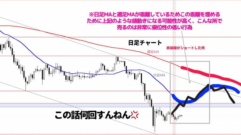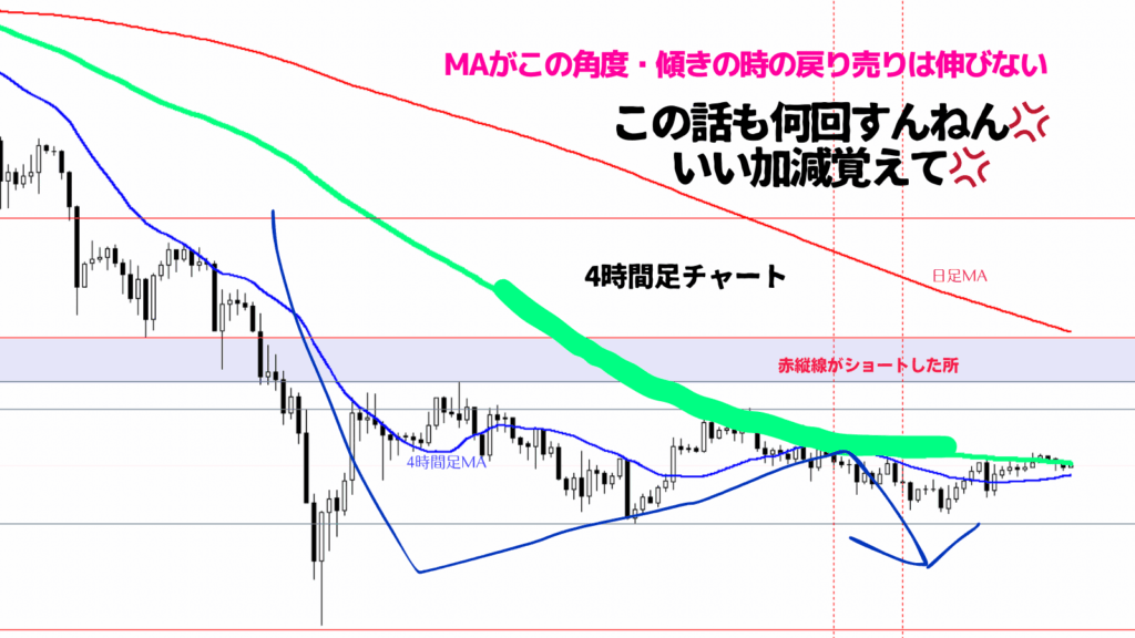 なので今お伝えしますが、MAがこの角度・傾きの時に戻り売り/押し目買いしても伸びる優位性は極めて低いので今日覚えてください。