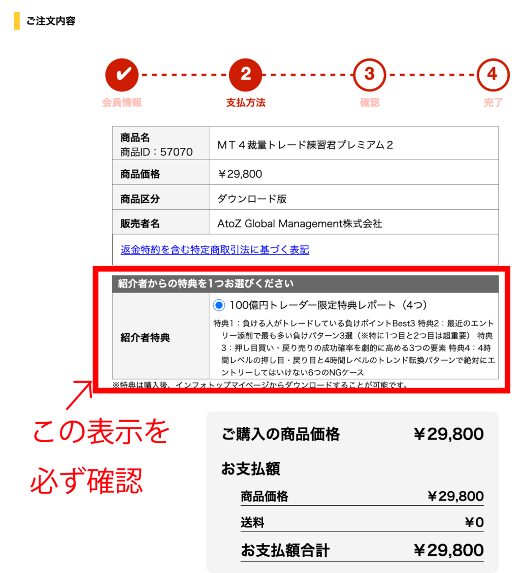 クリックすると下記の画面に変わりますので、ここで必ず「100億円トレーダー限定特典レポート(4つ)」という表示が出ているか必ず確認します。