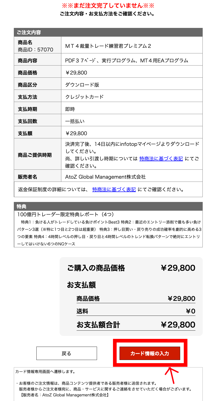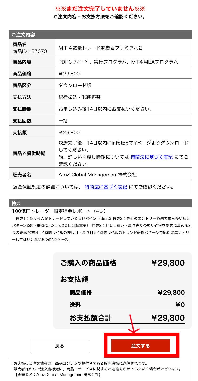 下記の画面に変わりますので、注文内容を確認して(※私の特典レポートの表示も要確認)、
